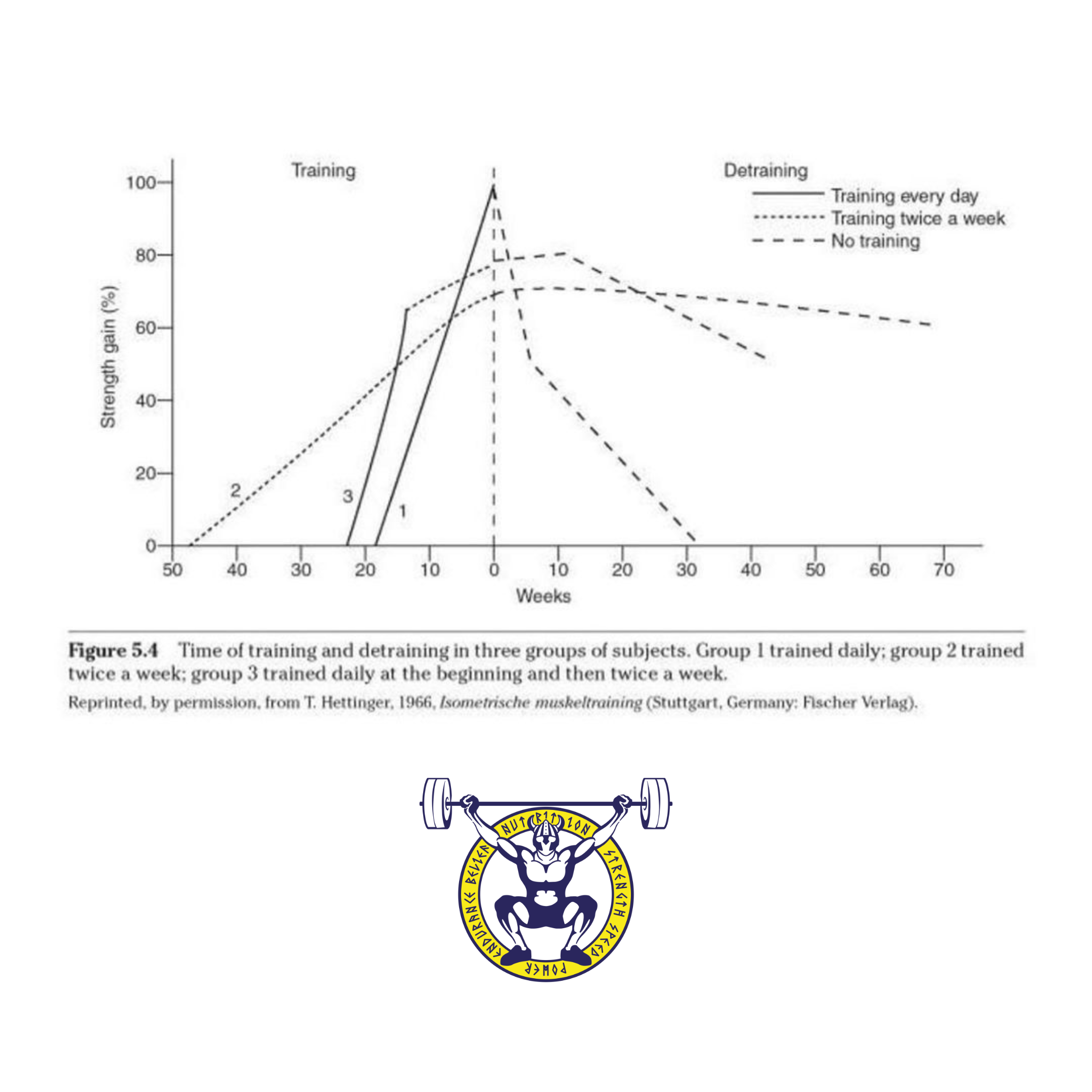 This classic Hettinger (1966) study shows how rapid strength gains from high-frequency training can disappear just as quickly as they come when frequency drops back to normal levels.